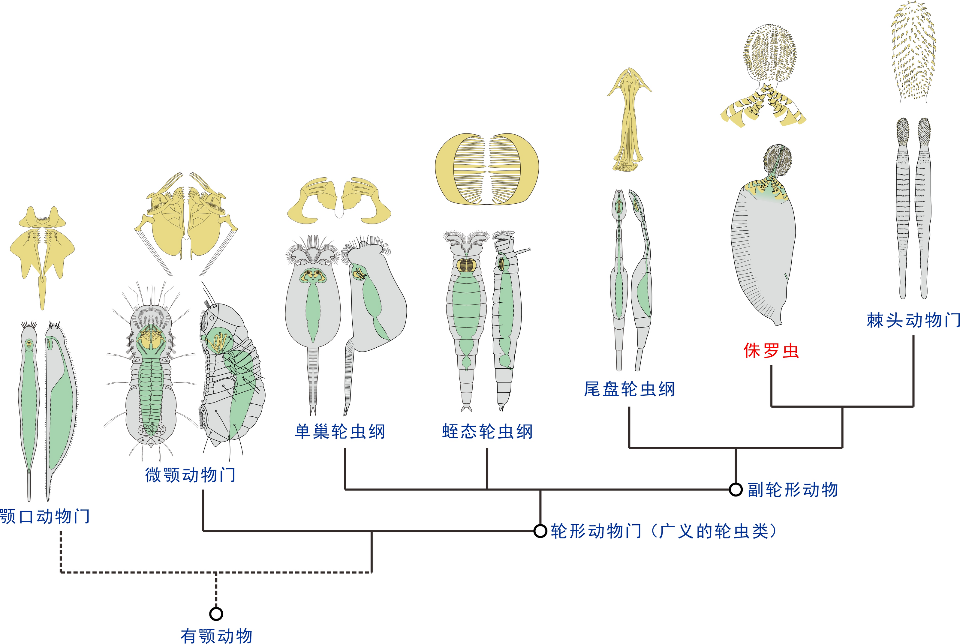 由于棘头虫的身体构型高度特化,其系统分类位置一直存在很大争议。基于不同的形态学特征,不同学者分别提出棘头虫与扁形动物门、鳃曳动物门以及轮虫动物门近缘的观点。然而,分子系统学分析表明,棘头虫最可能是轮虫动物门中一个特化的类群。但是,营体内寄生生活的棘头虫的身体构型与自由生活的轮虫有着很大的差异。