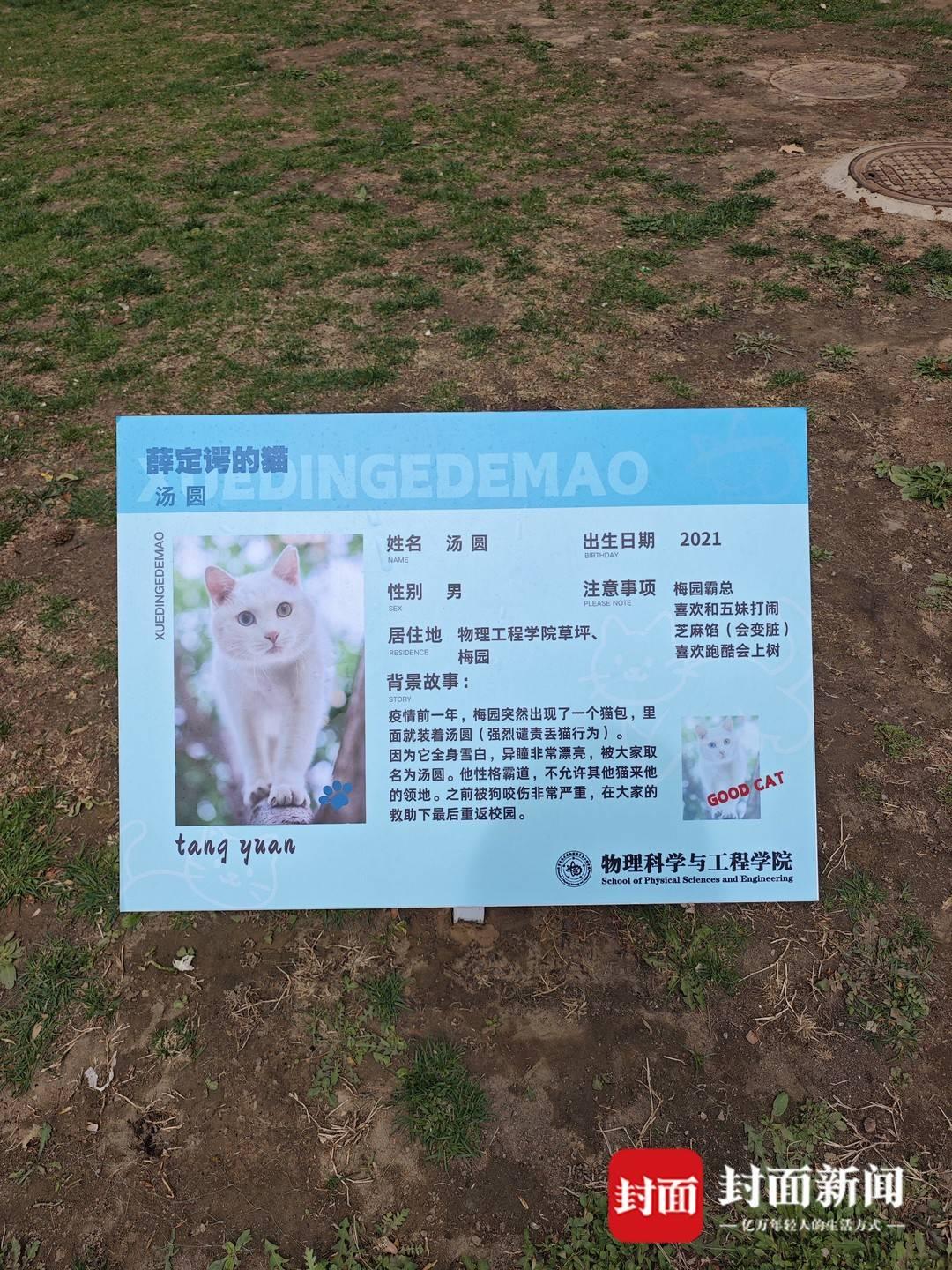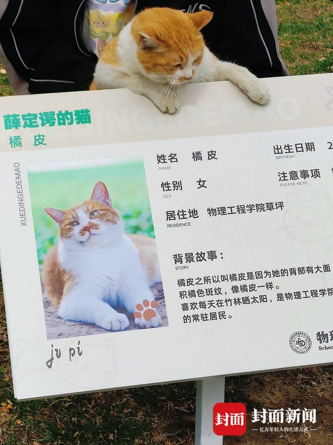而就在学校的物理科学与工程学院附近,有一片很大的草坪,经常能看见猫咪在草坪上晒太阳休息。物工学院的老师找到红果园喵喵队想一起打造猫咪文化展板。“正好我之前设计了一些猫咪名片,设计图就派上了用场。”希希介绍,经过一周时间的协调制作后,目前草坪上错落有致地摆放了6个校园猫咪名牌。