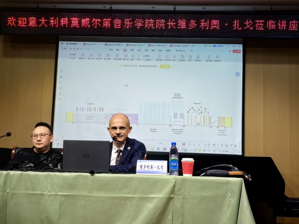 下午两点半,维多利奥・扎戈在音乐学院教八演播厅为苏州科技大学师生带来题为《欧洲作曲理论与维多利奥・扎戈音乐创作》的专题讲座。维多利奥・扎戈基于其《Segel》的创作技法,结合西方音乐理论,以图示化的形式向大家呈现了他音作品中的核心音高材料、织体形态、配器手法等,这种“图示化”分析方法既是作曲家诠释自我音乐作品的新路径;也将为苏科大师生分析现当代音乐作品带来新的启示。讲座现场互动热烈,师生就中意音乐教育差异、跨学科创作等问题与维多利奥・扎戈展开交流。音乐学院青年教师表示,讲座为拓宽国际视野、创新教学思路提供了重要启发。