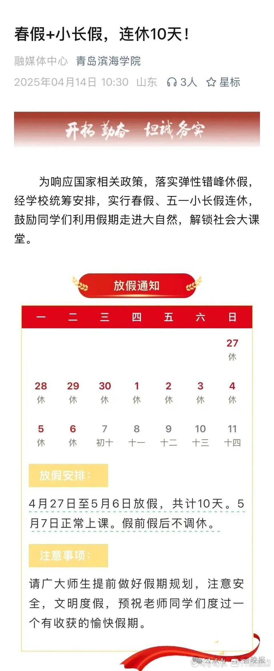 4月14日,青岛滨海学院官宣,学校今年实行春假、五一小长假连休,从4月27日一直放到5月6日,共10天假期。这是继青岛航空科技职业学院之后,山东今年第二所高校官宣放“春假”。