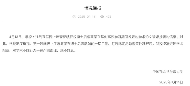 近日,有网友称中国社会科学院大学法学博士后焦某某论文涉嫌抄袭。4月14日,中国社会科学院大学发布情况通报称,已停止焦某某工作,并启动调查处理程序。