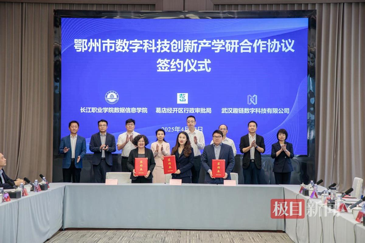 仪式上,政校企三方共同签订鄂州市数字科技创新产学研基地合作协议。湖北省数据局数字科技和基础设施建设处处长余寅与长江职业学院纪委书记张术平上台共同为产学研合作基地揭牌。根据协议,三方将发挥各自优势,聚焦区块链、人工智能等核心技术方向,围绕葛店国家经开区重点产业发展需求,联合开展科技合作、人才培养、平台建设、技术攻关和成果转化,提升区域数字经济发展支撑力,助力葛店国家经开区打造成为湖北省数字科技创新的重要策源地和示范高地。基地将建立一个数字科技攻关联盟、培育一批专精特新企业、打造一个产教融合示范平台、形成一套数字化转型标准、培养一支数字工匠队伍。首期落地的“区块链+智能制造”实训中心已吸引多家链主企业参与共建,预计年内可完成一批技术攻关。