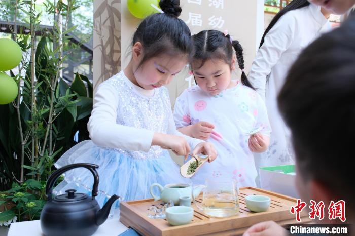中新网杭州4月19日电(曹丹)4月18日,浙江杭州首家以“西湖龙井茶”为主题的西子湖幼儿园举行第四届茶文化活动,旨在引导学龄前的孩子感受茶文化的魅力。