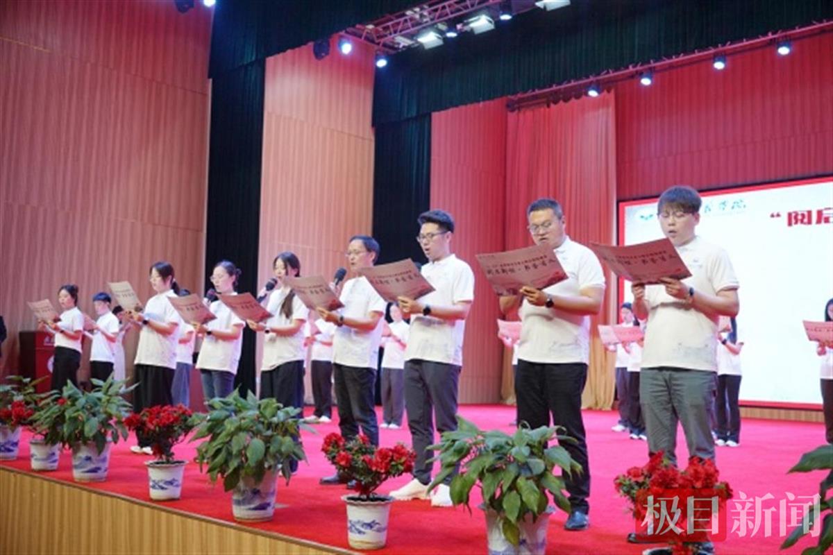 “纵使前路漫漫,吾辈自当以青春之名,赴时代之约……”活动最后,全体师生在激昂的音乐声中齐声朗诵《青春之歌》。尾声处,“青春万岁!奋斗不止!请党放心,强国有我!”的誓言,为诵读注入震撼人心的时代强音。