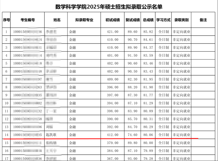 4月26日,一名拥有400万粉丝的网红博主“汤匙不是钥匙”称,通过考研已考进北京大学数学科学学院(以下称北大数院)金融专业(拟录取名单)。“汤匙不是钥匙”本名叫匙凯歌,今年2月底,他在视频平台晒出自己的北大考研初试成绩,为412分,专业排名第二,当时就引起了一波讨论。据北大数院发布于今年4月3日的《数学科学学院2025年硕士招生拟录取公示名单》显示,该名单序号第14为匙凯歌,拟录取专业为金融,学习方式是全日制,非定向就业。
