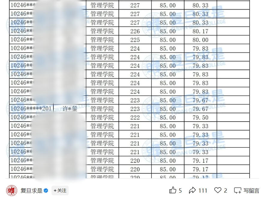 有报道提到,匙凯歌的许多视频都与解数学题相关。从中学数学到大学数学,各类数学讲解一应俱全。匙凯歌本人聊起数学也滔滔不绝:“在初中时,我最感兴趣的是平面几何;高中阶段,则偏爱各种不等式;上了大学,高等概率论、测度论等,学起来都觉得很好玩。”4月24日,“复旦求是”微信公众号发布2025年入学复旦管理学院MBA、EMBA、MPAcc项目拟录取考情分析,有网友发现,其中就有网红博主“迅猛龙 特蕾莎”许锴蓥。许锴蓥表示,自己考的是专硕,是非全日制MBA(工商管理硕士),总分223分,两科分数分别为管综140分、英语二83分,比自己预估的多考了20分。复旦大学MBA、EMBA拟录取名单,许*蓥名列其中。“复旦求是”微信公众号文章截图