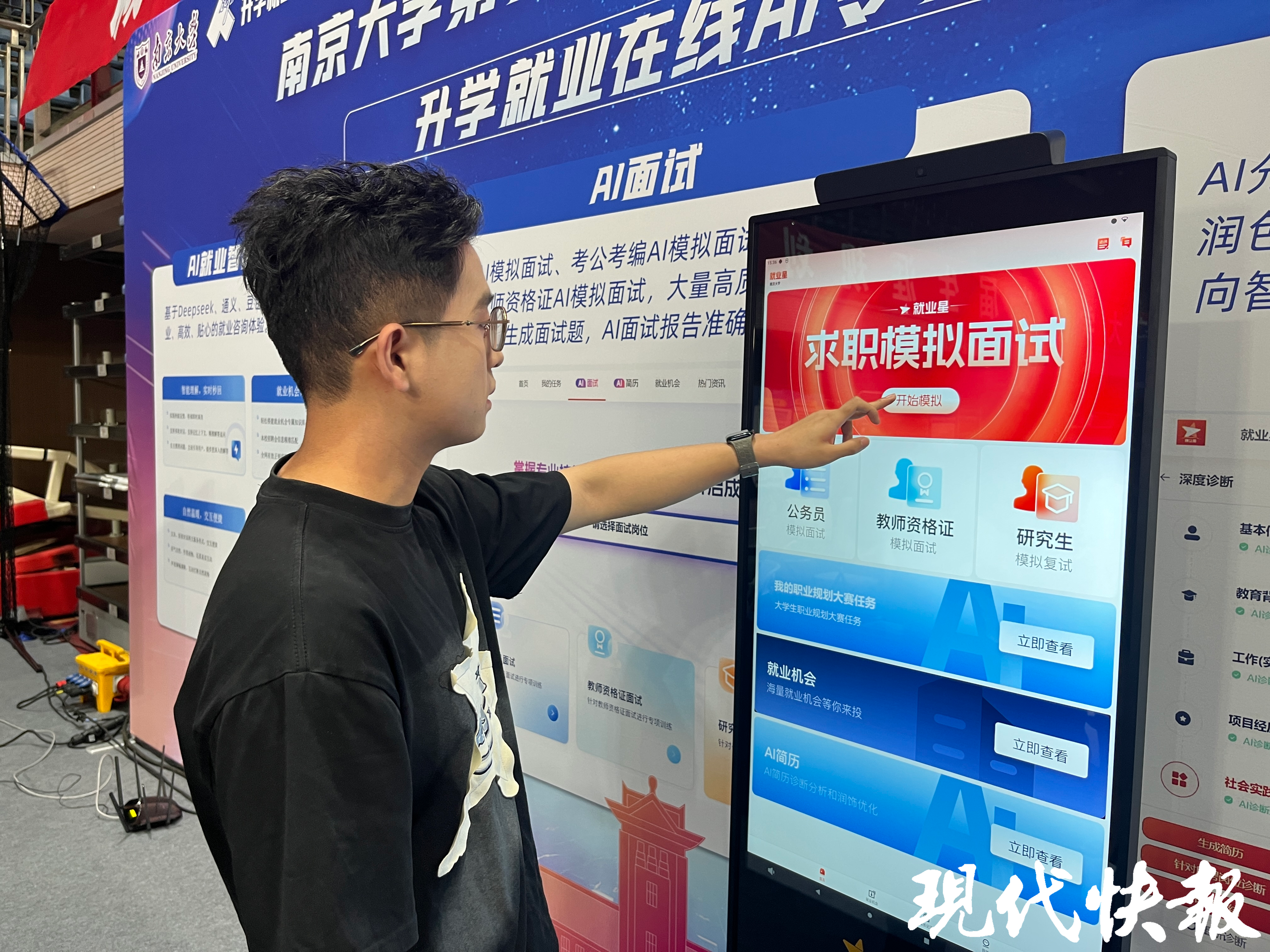 现代快报讯(记者于露文/摄)4月27日,“AI赋能兴就业奋进扬帆向未来”南京大学2025年生涯规划嘉年华之全职、实习双选会在仙林校区举办。现场,186家知名企业提供近1.7万个岗位,其中40%的岗位与人工智能领域相关。此外,活动设置的AI就业智能咨询答疑、AI面试等服务也是“AI味儿”满满。