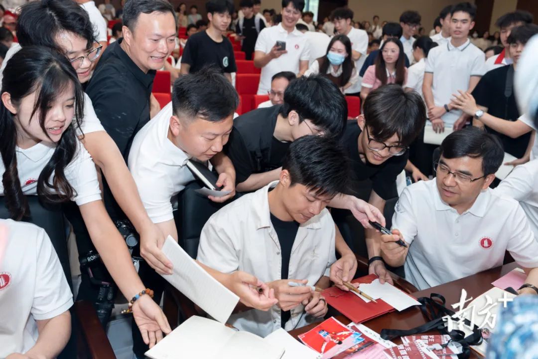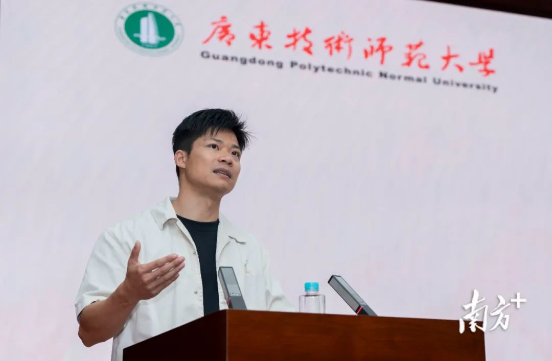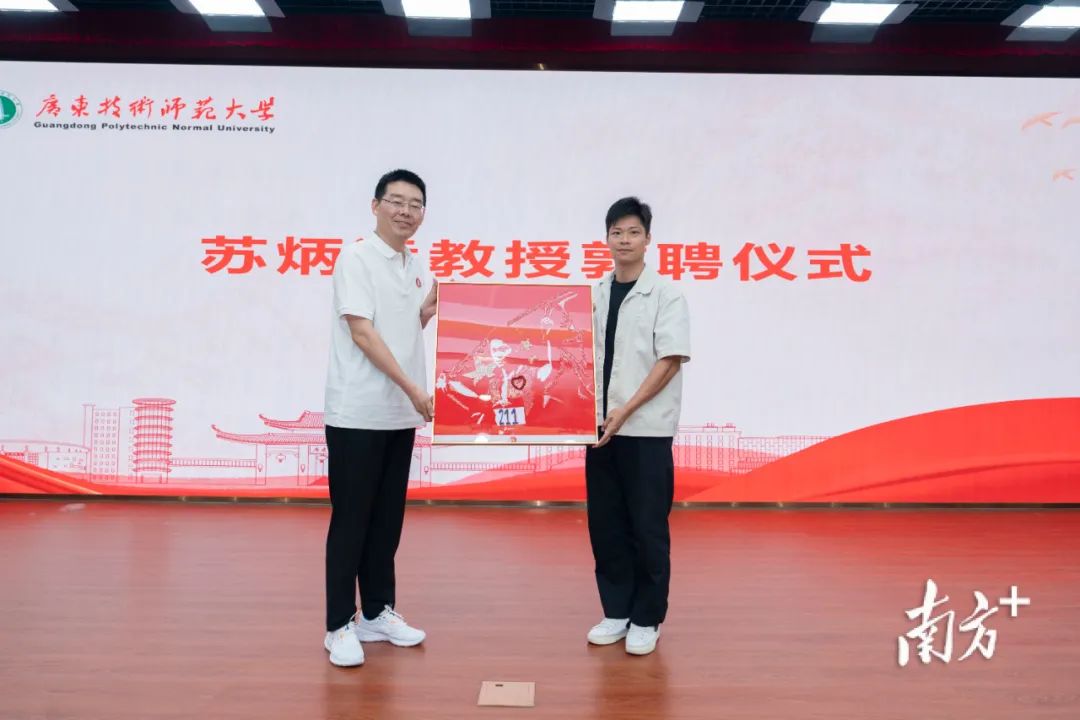 仪式上,苏炳添接受了广师大校领导颁发的客聘教授证书。在讲座上,苏炳添还与同学们分享比赛路上的心得体会,并与现场同学互动。