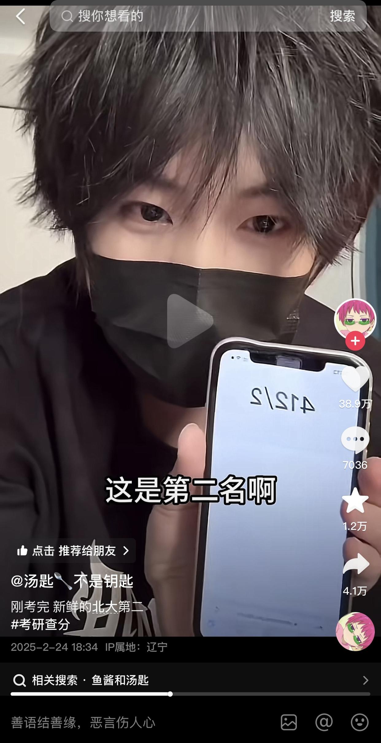 网红“汤匙不是钥匙”本名叫匙凯歌,本科就读于东北财经大学。今年2月底,他在视频平台晒出自己的北大考研初试成绩,为412分,专业排名第二,当时就引起了一波讨论。据媒体报道,针对普通学校考入北大,匙凯歌坦言,这并不能代表什么,因为每个人在大学阶段的努力程度是不一样的,“只要你觉得自己的努力程度够了,有了考的希望,就可以去尝试报考一些顶尖的大学。”匙凯歌称,自己进入北大学习后,肯定以学业优先,但不会放弃自媒体更新。考研的时候,他也是学习两三天,然后拿一天拍视频,顺便休息调整一下。如今考进北大数院,他觉得更便于利用自己的知识和经验,向粉丝们贡献一些学习数学的“干货”。