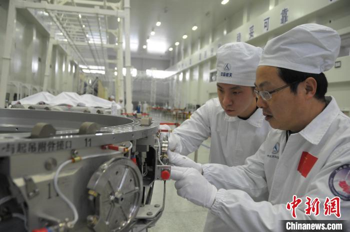 资料图:赵杰(左)与他的师傅王曙群在调试对接机构。(中国航天科技集团八院149厂供图)