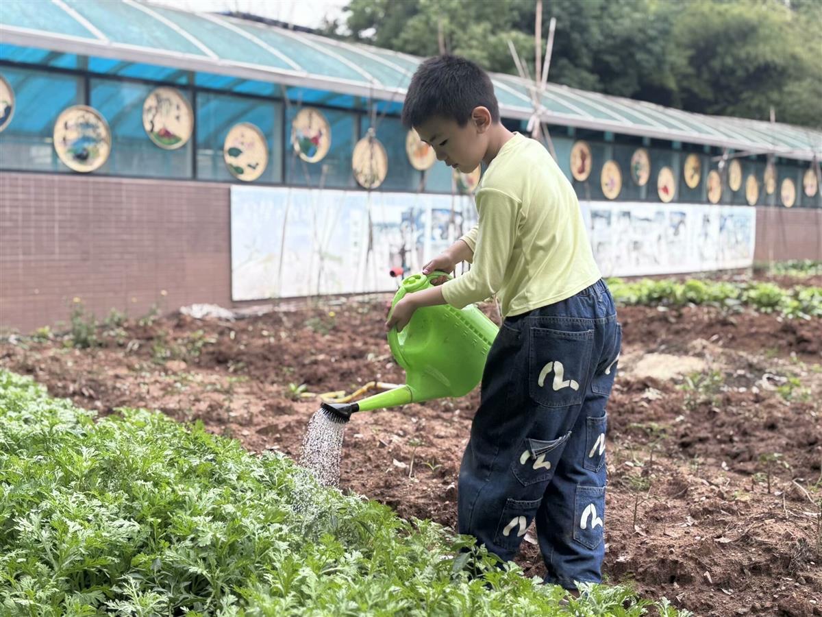 一至四年级学生开启“责任田认领与管理”,各班以小组为单位制定《养护轮值表》与责任田周管理计划,利用课后服务时间在此劳动。老师讲解植物习性,带领同学们挥锹铲土、播种浇水,最后,孩子们填写《劳动实践清单》记录自己的收获。