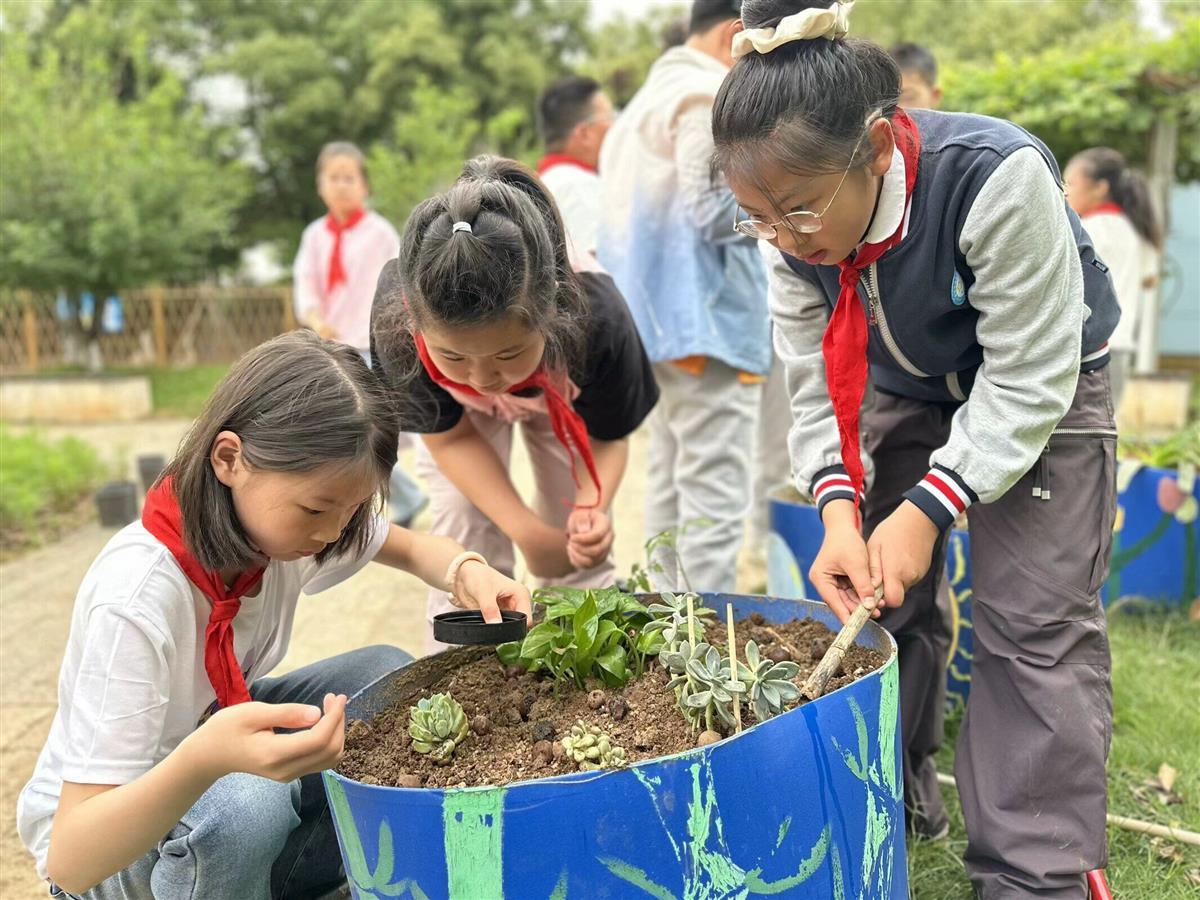 五年级学生开展“花桶认领与种植”活动,每人带来一两盆精心挑选的盆栽装点启星农场,小组分工制定《养护轮值表》,将花桶管理细化到每周。在老师的带领下,学生们定期打卡呵护幼苗,见证花朵从含苞到盛放的全过程。