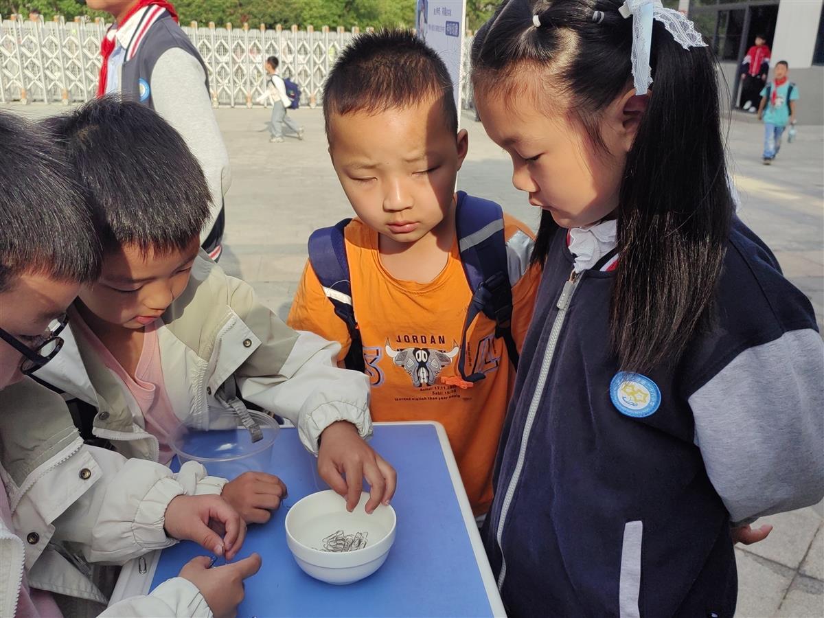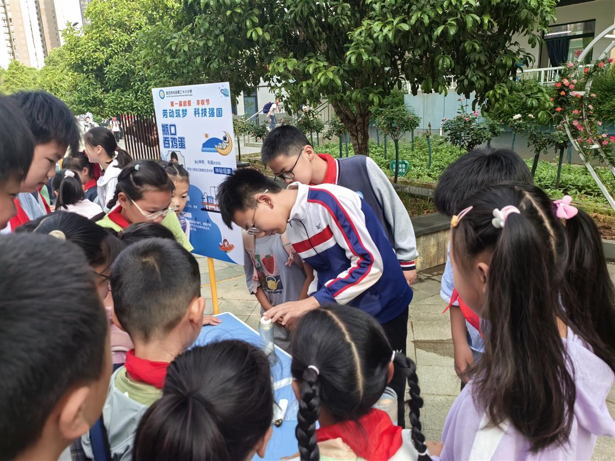 4月30日,学校丰收节科学实验展示区俨然成为沸腾的实验室,六个年级的互动实验站台被学生围得水泄不通。随着“噗嗤”一声,鸡蛋瞬间被“吞”进瓶中,围观人群爆发出惊叹声和掌声。