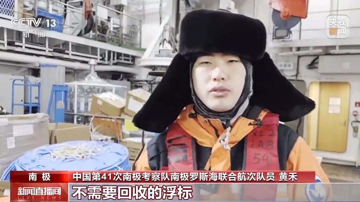 中国第41次南极考察队南极罗斯海联合航次队员 黄禾:咱们这个标主要是测海水一个流速,即抛式的,不需要回收的浮标,数据也是靠卫星返回到国内。验证我们自主研发的装备,再一个就是看数据的可靠性。