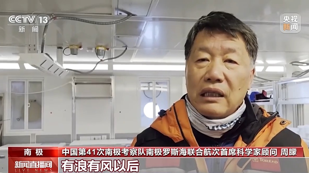 中国第41次南极考察队南极罗斯海联合航次首席科学家顾问 周朦:如果没有浪,冰就结成一块了,有浪有风以后,它就会开裂,会漂动,相对来说它容易融化。阳光也可以透过冰到海水里面去,促进冰和海相间的时候,海水里面的初级生产力,促进生态系统。