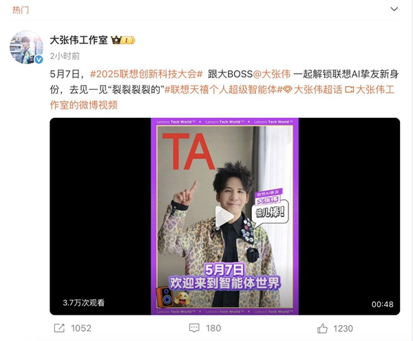 5月5日,大张伟工作室宣布大张伟解锁“联想AI挚友”新身份,并同步发布了一支悬念满满的视频。画面中,一台银灰色人形机器人手持联想moto手机,向大张伟发出神秘邀约。联想官方也隔空呼应,并发文“TA来了,联想天禧个人超级智能体,倍儿棒的超级AI助理,5月7日,一起嗨!”