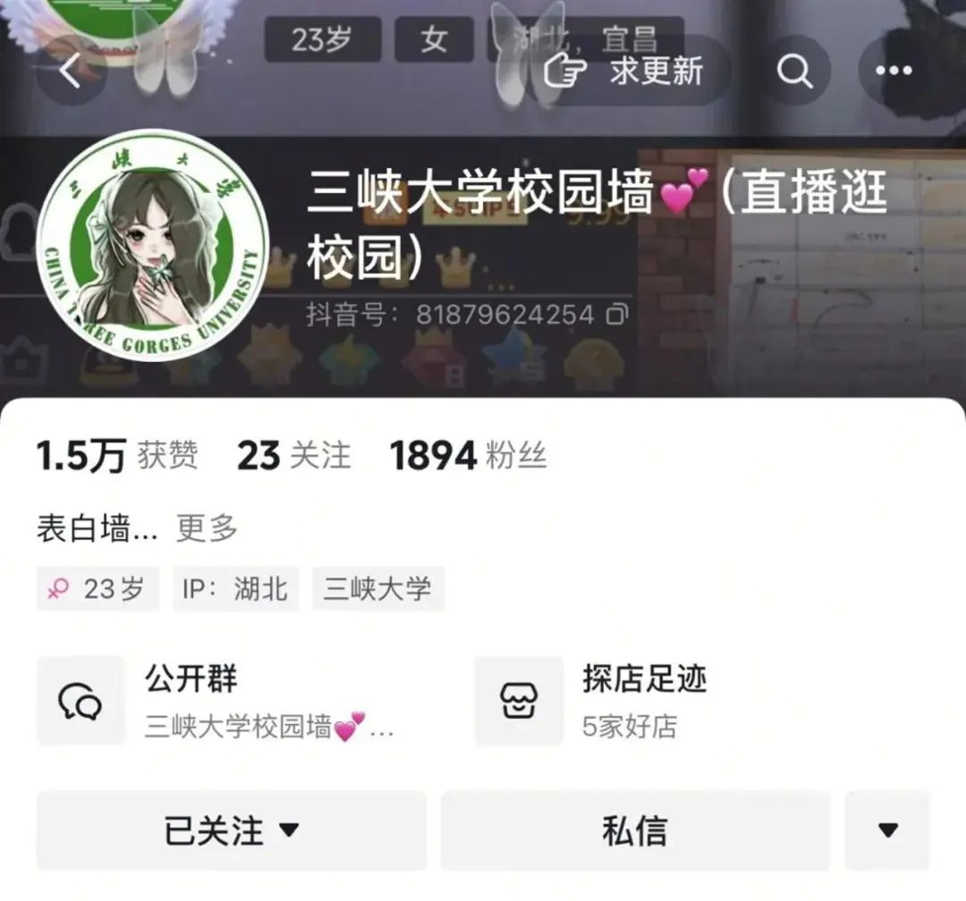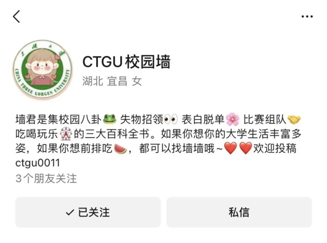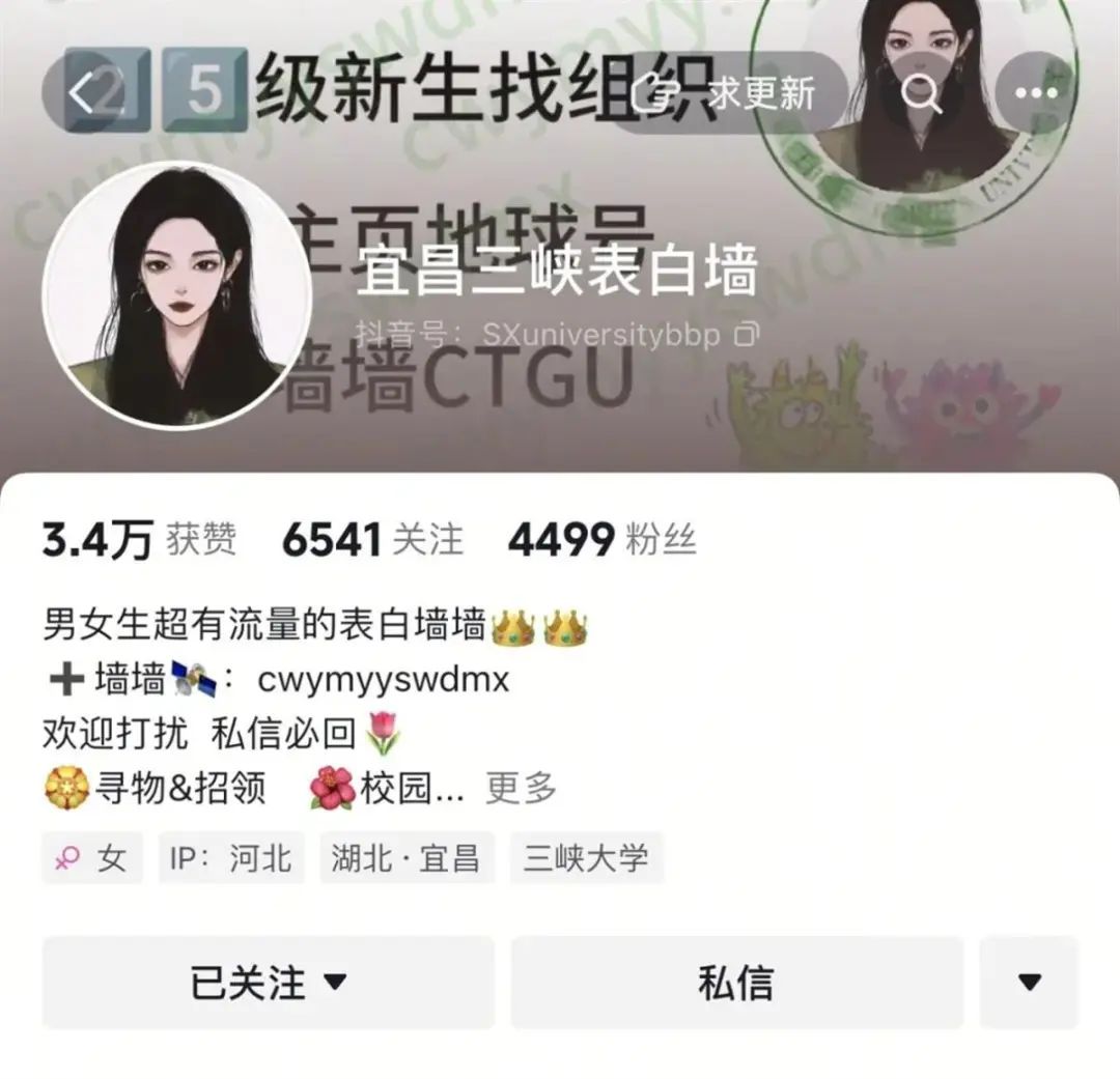 5月8日,三峡大学官微发布最新声明,称近期在网络上出现,如“三峡大学表白墙”“三大表白墙”“三峡表白墙”“宜昌三峡表白墙”“三峡大学校园墙”“CTGU校园墙”等平台或账号,未经学校正式授权擅自使用“三峡大学”“三大”“CTGU”“SXDX”等学校名称、校徽等标识。