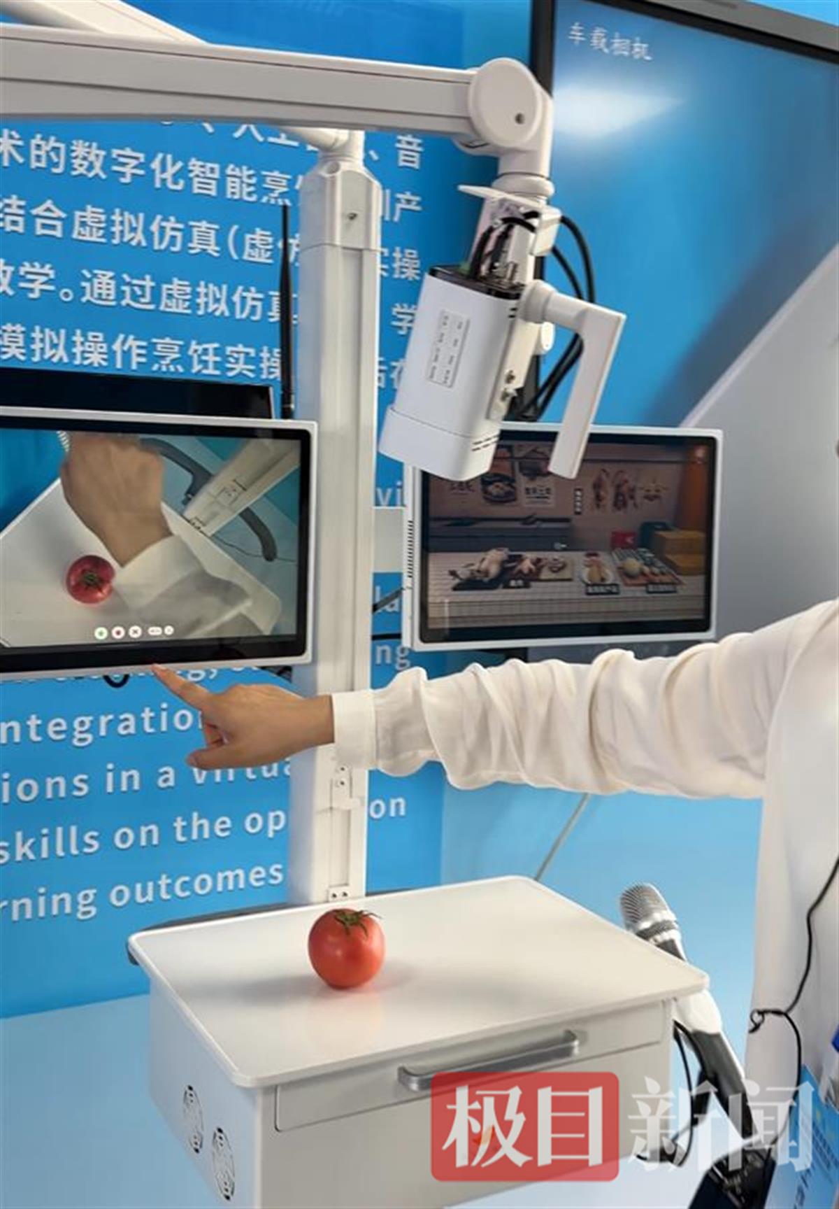 洗番茄,切番茄,投放食材……在炒菜机器人展台,一台通过数字化菜单实现全自动烹饪的教学设备正在改变着传统的教学模式。