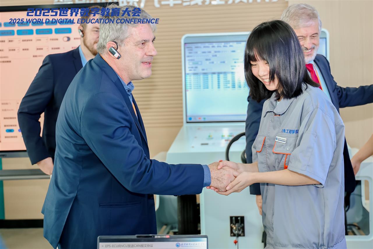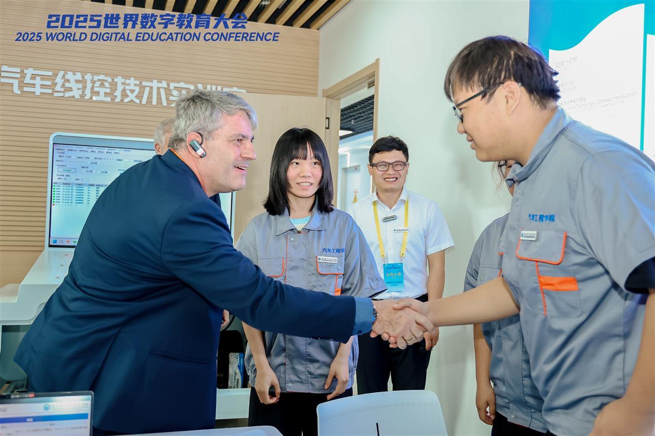 在武软智能网联汽车线控技术实训室,马塞洛·布雷加尼奥利(前排左一)热情与学生们一一握手,祝大家学有所成(来源:2025世界数字教育大会会务组)