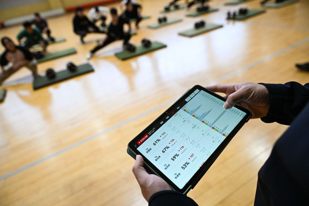 2025年3月21日,在中国农业大学东校区,减脂课教师通过仪器实时监测参加课程学生的心率等指标。新华社记者 陈钟昊 摄