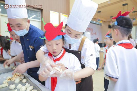 此次活动得到了武汉农投金银湖餐饮管理有限公司的大力支持,公司派出的特邀大厨们在各参赛队伍间来回巡视,不时给予专业的指导和建议。在大厨们的帮助下,小选手们信心倍增,更加大胆地发挥创意,将普通的食材变成一道道令人垂涎欲滴的美食。与此同时,来自武汉农投金银湖餐饮管理有限公司的大厨们化身“美食导师”,以精湛的厨艺现场演绎美食制作全过程。学生们在厨师指导下分组制作烘焙点心与中式面点。称量面粉、调配蛋液、揉制面团……孩子们围在操作台边,跟随步骤学习制作饼干、蛋挞、小蛋糕与包子。烤箱的热气蒸腾着期待,蒸锅的白雾缭绕着兴奋,当亲手制作的美食新鲜出炉,孩子们捧着成品互相分享,笑容里洋溢着劳动的成就感。