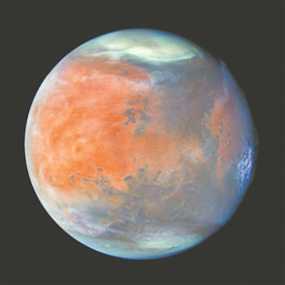 图② 哈勃望远镜独特的紫外光观测能力揭示了火星上薄薄的水冰云层。