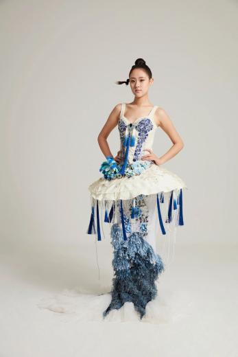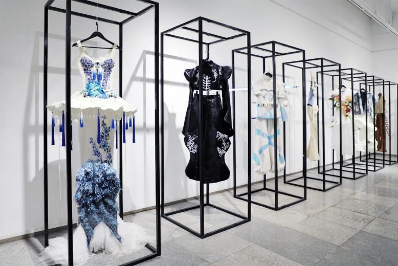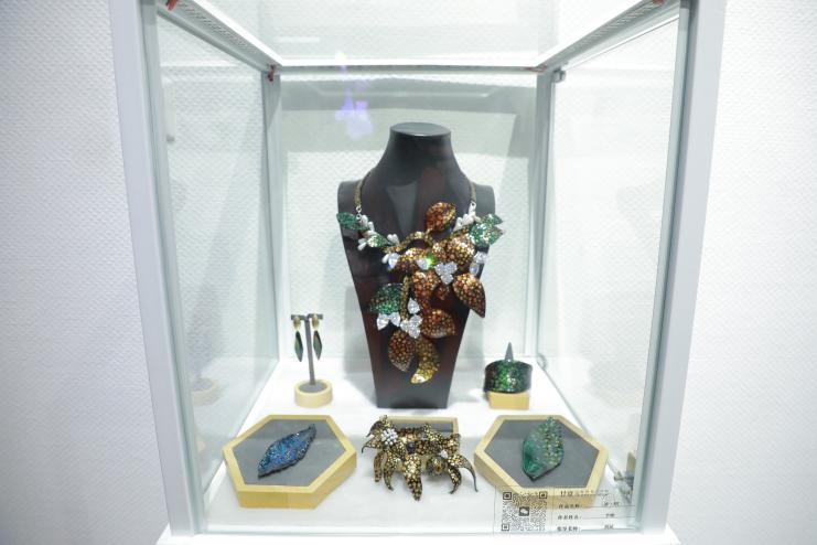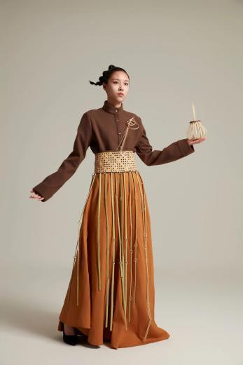时尚设计学院时装《风映青瓦》《筠篾》独具巧思,前者运用提花、嵌花等针织技术,巧妙地将瓷器纹样与针织面料相融合,赋予现代服饰东方时尚活力与灵动感。后者则从传统竹编工艺中汲取灵感,把盘丝和圆口编等传统技法融入新中式风格,尽显质朴自然韵味,而首饰《漆·熠》大胆尝试大漆滴金技法,以金点错落散布于漆叶之上替代满钻镶嵌,将东方漆艺的含蓄优雅与西方珠宝的绚烂张扬糅合于现代设计语境中,展现传统工艺独特魅力。