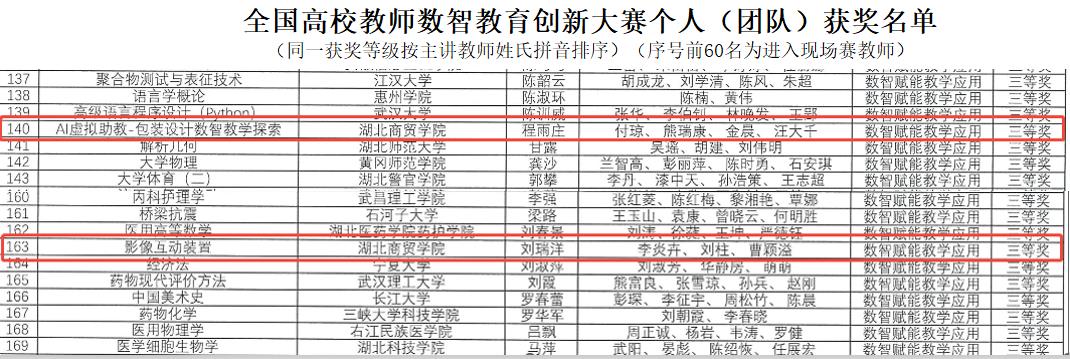 近日,首届全国高校数智教育创新大赛评选结果揭晓,湖北商贸学院教师凭借出色的数智赋能教学应用成果,在大赛中脱颖而出。来自该校艺术与传媒学院的刘瑞洋老师主讲的《影像互动装置》课程与程雨庄老师主讲的《包装设计》课程,凭借前瞻的教学理念、创新的数智化实践成果,双双荣获大赛三等奖,彰显了学校在数智教育领域的深厚实力与育人成效。