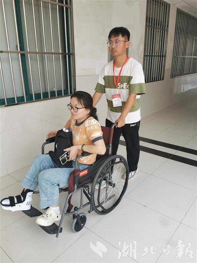 工作人员为行动不便的考生送考。 (受访者供图)