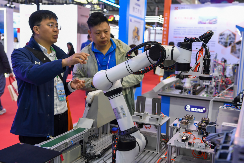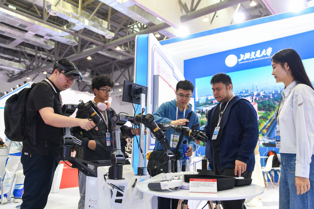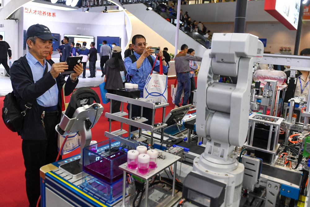 5月23日,观众在第63届高等教育博览会上了解机械臂。新华社记者 张楠 摄