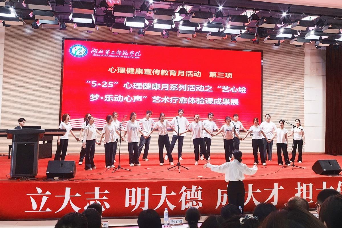 “留下你的祝福,寒夜温暖我……”5月24日,湖北第二师范学院2025年“双心关爱”工程暨“5・25”心理健康宣传教育月展示会现场,20名曾自认为“五音不全”、对唱歌“又爱又怕”的学子,经过“艺心绘梦·乐动心声”疗愈体验课程的浸润,自信站上舞台,面对400名师生放声歌唱《再回首》,以动感旋律传递内心真挚情感,展现自我绽放的勇气。