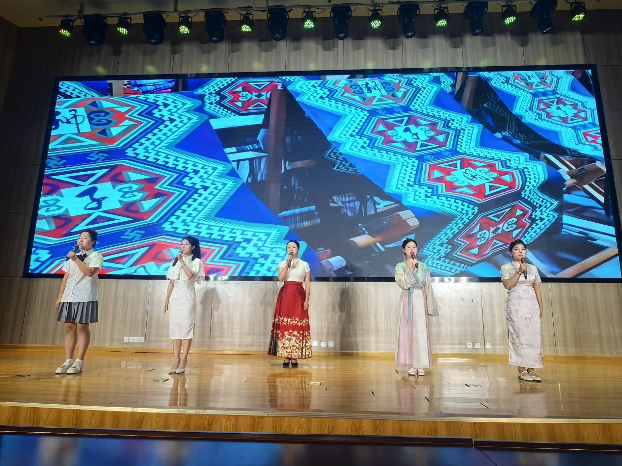 非遗文化篇章同样震撼人心。由刘奕麟、王佳琪、江雨薇、鲍洁和历歆燃五位同学表演的《以声织梦·非遗不息》节目中,学生们化身汉绣、缠花、船雕等荆楚非遗的“青春代言人”,以解说与表演结合的方式,将西兰卡普的斑斓纹样、皮影戏的灵动剪影化为可触可感的叙事语言。