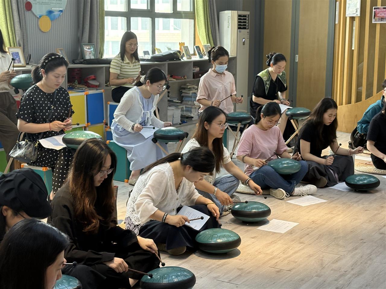 在另一边的音乐教室,老师们正学习着空灵鼓,一首《闪烁的小星星》很快就在教室内规律地响起。“空灵鼓的声音听起来特别愉悦舒适,感觉这一趟来值了!”来自硚口区博学初级中学的宋梦琪老师说,“我觉得这个活动可以推广到我们学校,对压力比较大的学生和初三备考学生应该会有一定帮助。”