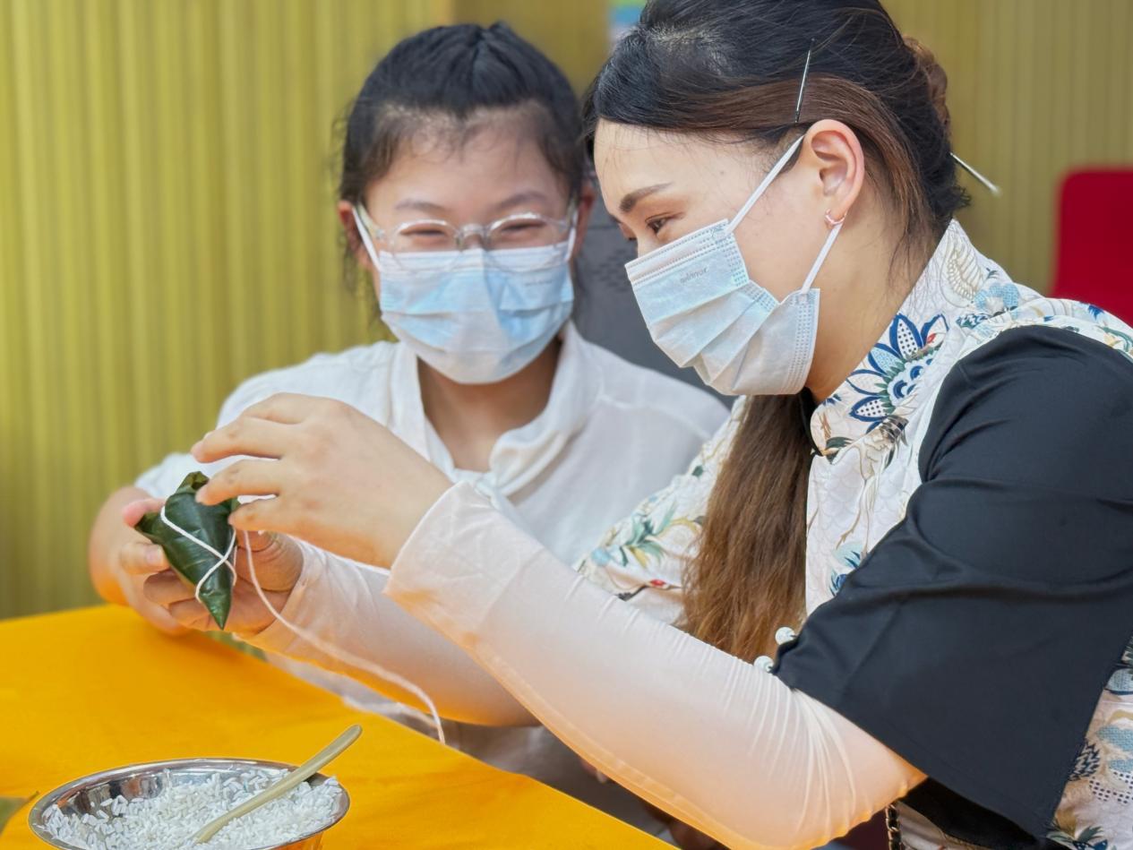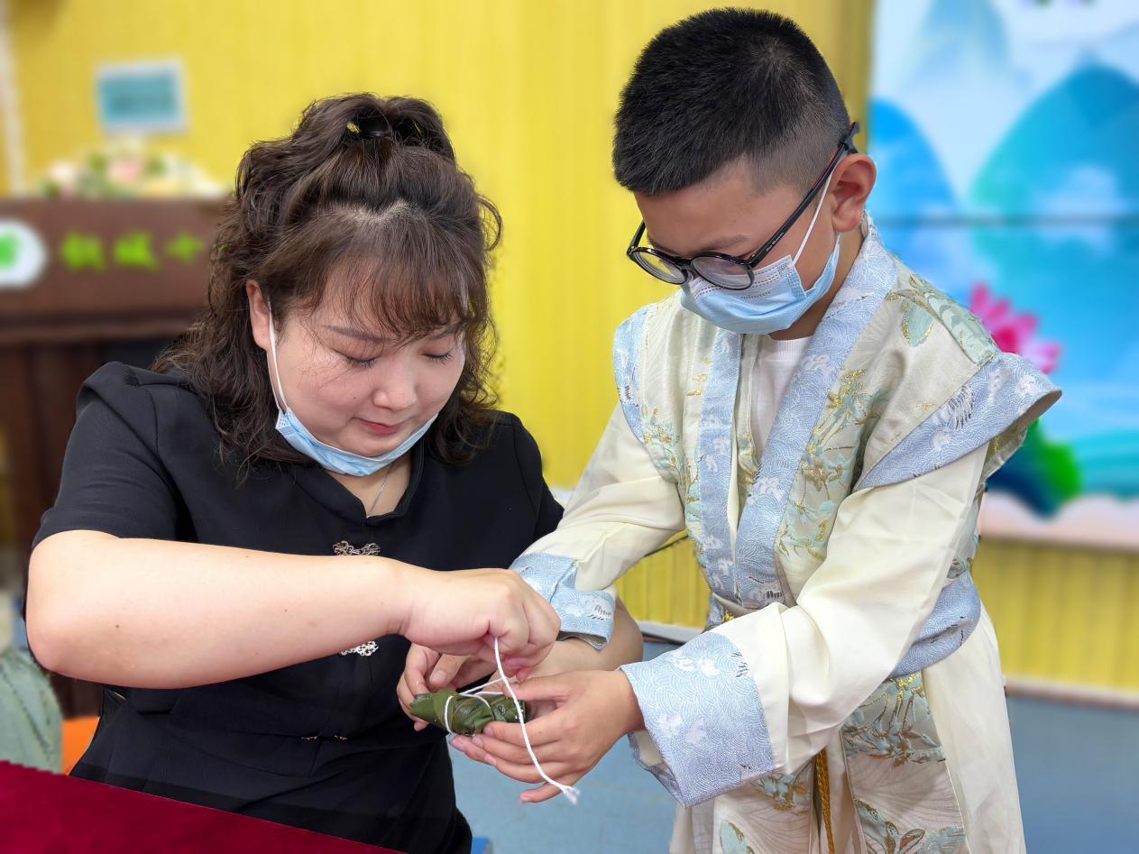 活动现场,粽叶、糯米、蜜枣等材料一应俱全,摆放得整整齐齐。家长和学生们身着中式服装,仿佛穿越回了古代。亲子之间相互配合,从折粽叶、填糯米,到裹粽叶、扎线,每一个步骤都做得一丝不苟。“以前我吃粽子时,总是在想它是怎么做成的呢?现在我知道了,原来包粽子可不容易呀。和妈妈一起包粽子,感觉这个端午节也变得甜甜的了!”504班胡袁韵萌学着妈妈的样子,小心翼翼地为粽子系上棉绳。