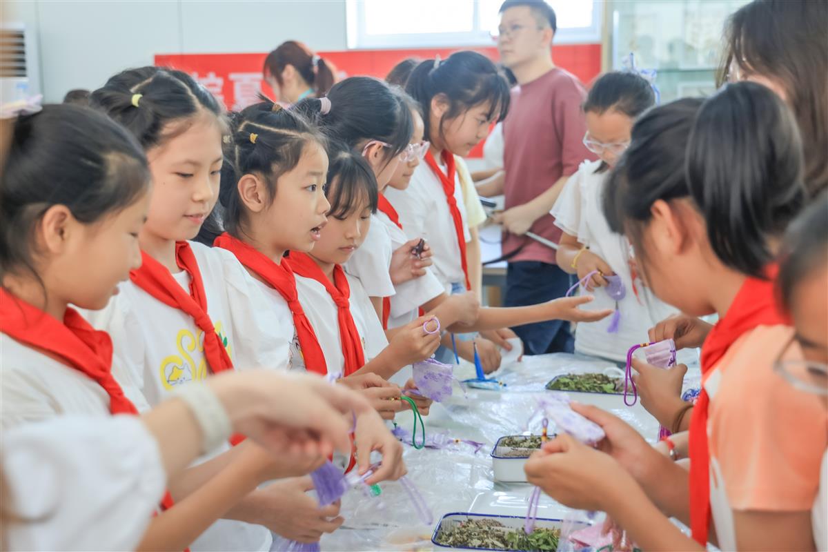 “五月五,是端阳。插艾叶,点香囊。”端午佳节前夕,武汉生物工程学院中医药陈列馆热闹纷呈,该校医药学院联合武汉市新洲区钱学森学校组织开展的“粽夏童乐,本草奇缘”活动在这里举行,31名“自立班”的小学生在大学生志愿者的带领下和讲解下,识本草、制香囊、做漆扇,开启“中医药探秘之旅”,让端午节日“香”了起来、传统文化“活”了起来。