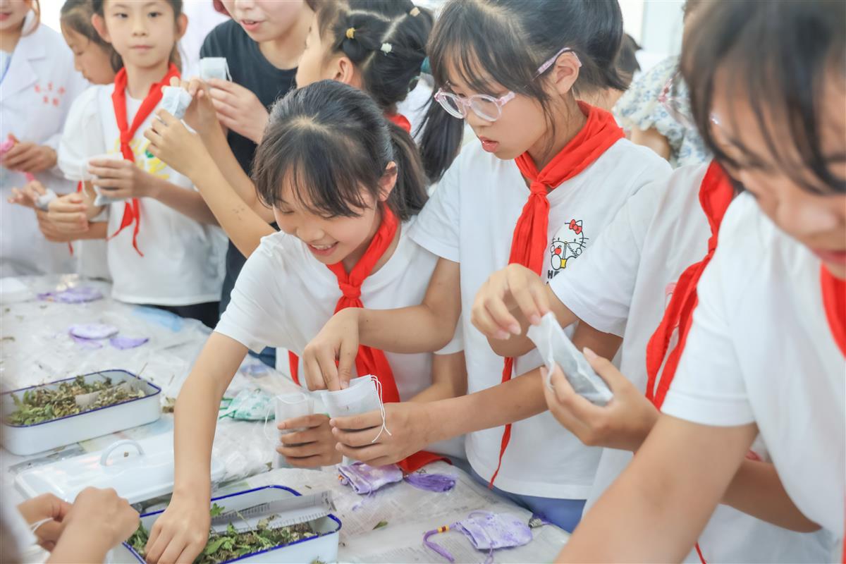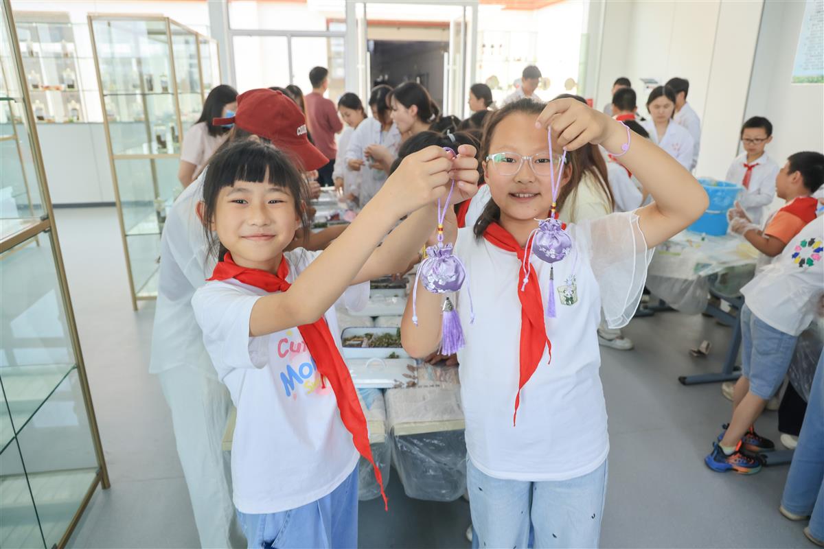 活动现场,该校医药学院副院长、中医药陈列馆副馆长尤园,从神农尝百草的传说到现代中药研发成果,从形态各异的药材标本到古老的制药器具,讲述中医药发展脉络,邀请孩子们辨识薄荷、艾草等常见药材,通过讲解与提问互动,加深学生对中医药知识的了解。随后,孩子们在医药学院百草协会志愿者一对一指导下,用薄荷叶、薰衣草、白芷等中草药制作香囊,学习“芳香避秽”的中医养生智慧。“原来中药材不仅能治病,还能变成漂亮的饰品!”李雨泽小朋友高举着自制的中药香囊兴奋地说。