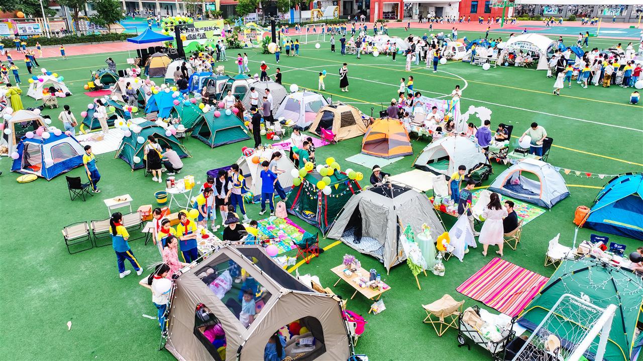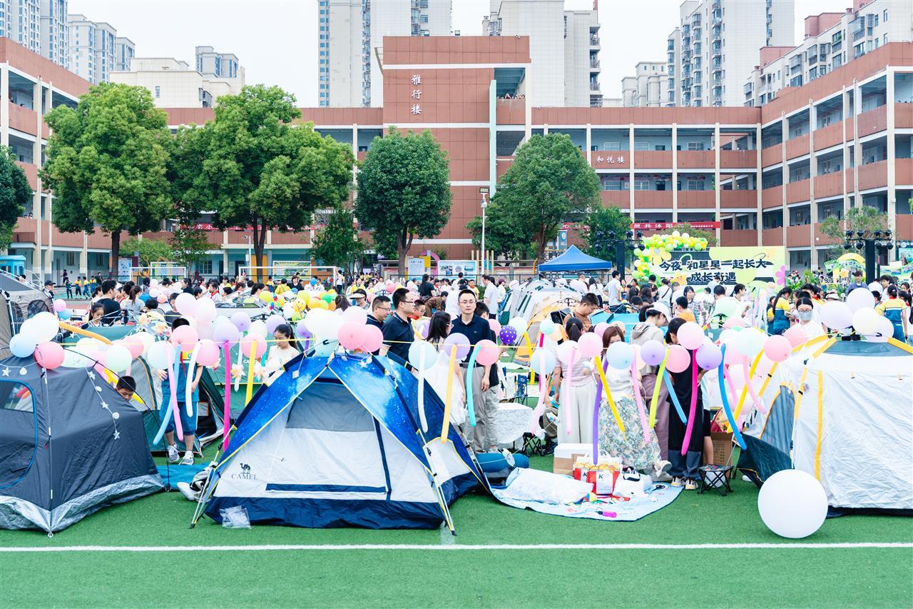 5月27日晚,武汉市光谷第五小学的操场飘来炊烟与笑语:绿茵场上长出百余顶缀满暖黄灯串的帐篷,烧烤派对、音乐节、露天电影放映等应有尽有。