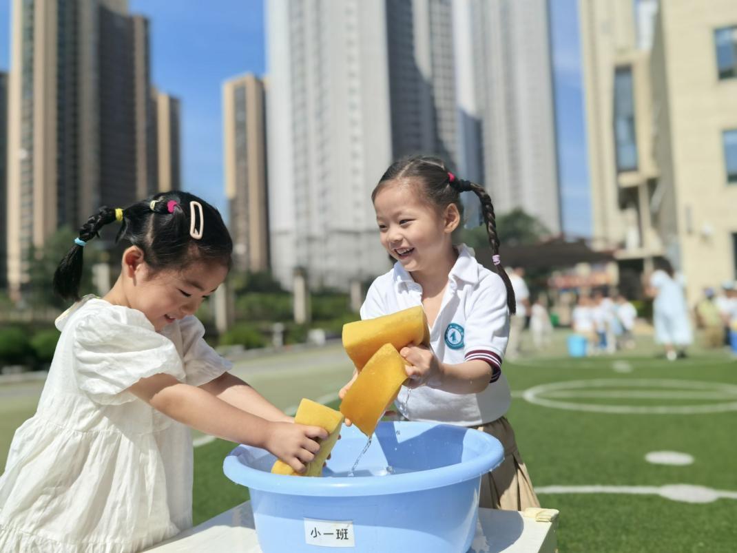 小班幼儿则在游戏中展现出勇气与爱心。孩子们欢快地踩水“炸弹”,乐此不疲;滑梯接水游戏时,他们专注地用小水盆在“水龙滑道”下接水,只为给小树苗送上“亮晶晶的礼物”。