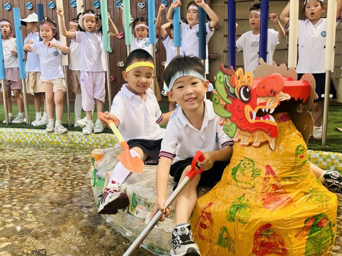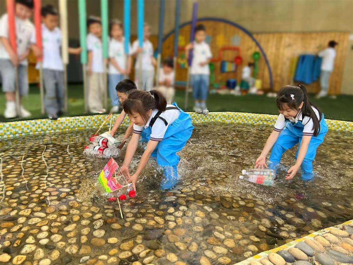 活动现场,不同年龄段的孩子们参与了各具特色的水游戏项目。大班幼儿展现出出色的协作能力与创新思维。在合力运水比赛中,孩子们两两一组,认真讨论运水策略,“喊123保持平衡”“杯子放中间更稳”。孩子们比赛时默契配合,脚步整齐。水上龙舟赛环节,随着一声令下,自制龙舟上的孩子们奋力划桨,加油声、划水声交织,充满激情与活力。