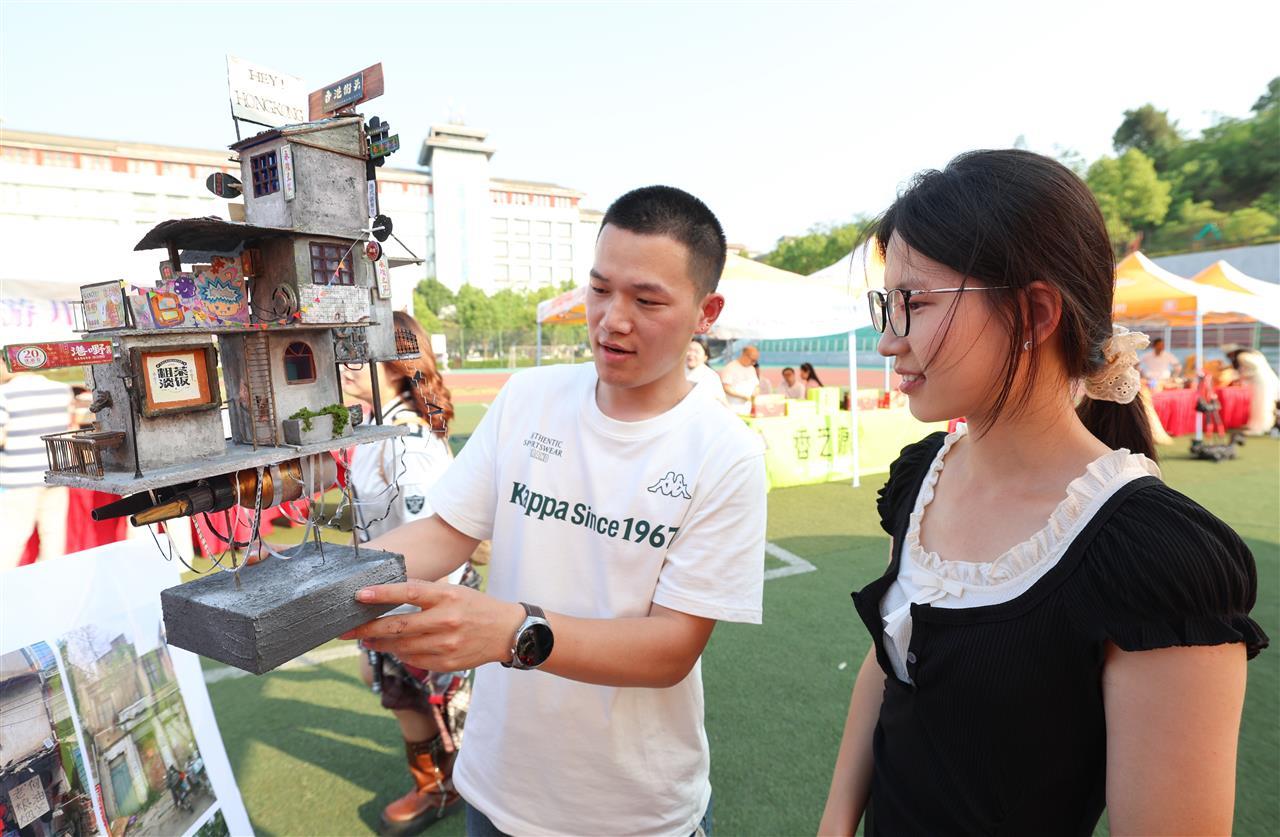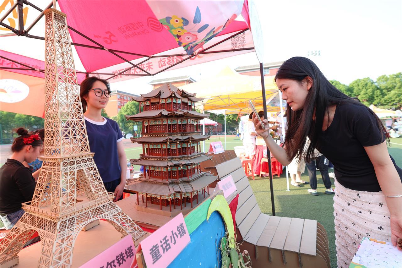 现场的微缩传统建筑与环保艺术作品展区成为现场火热“打卡点”,同学们以精湛工艺复刻襄阳标志性老建筑,青瓦飞檐间流淌着历史韵味。“看着这些微缩建筑,仿佛能触摸到襄阳的过去,而环保作品又让我看到传统与未来的联结。”一名参观的同学感慨。
