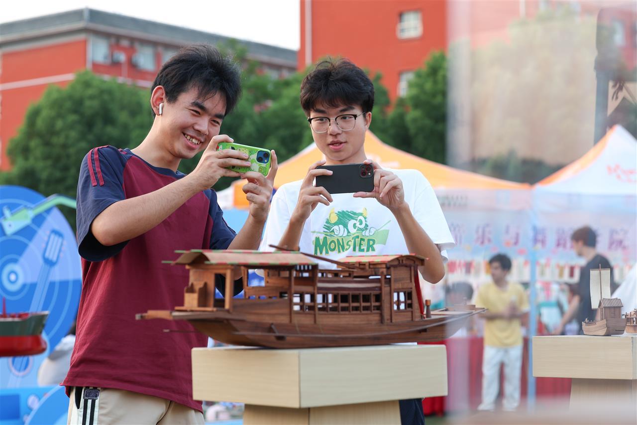 活动现场,不同高校的学子们相互交流,分享创作心得与艺术感悟;企业代表与师生积极互动,探讨产学研合作的新方向与新可能。在“襄船”木艺传承与创新艺术实践工作坊展台前,精美的木船模型吸引了众多目光。
