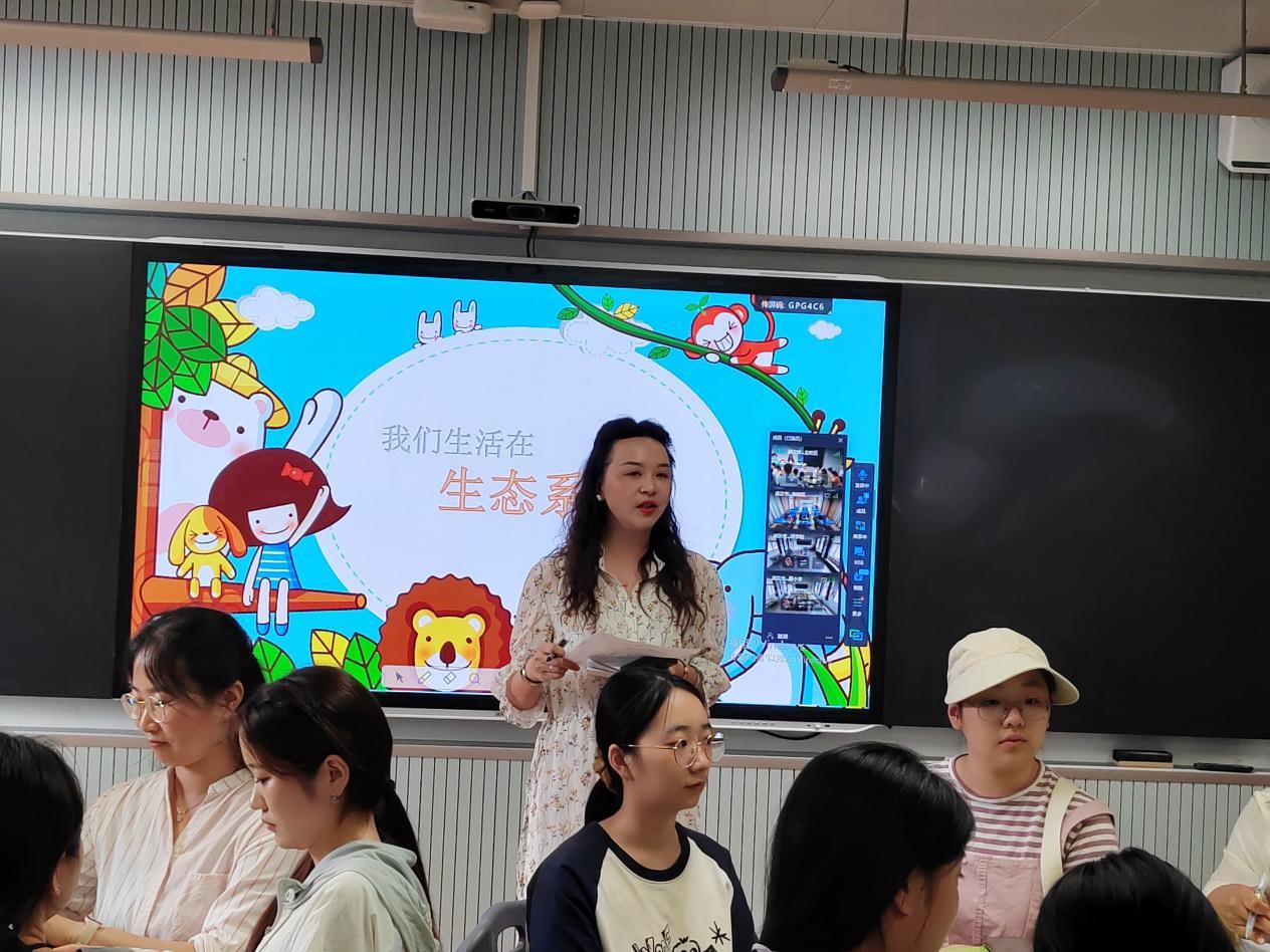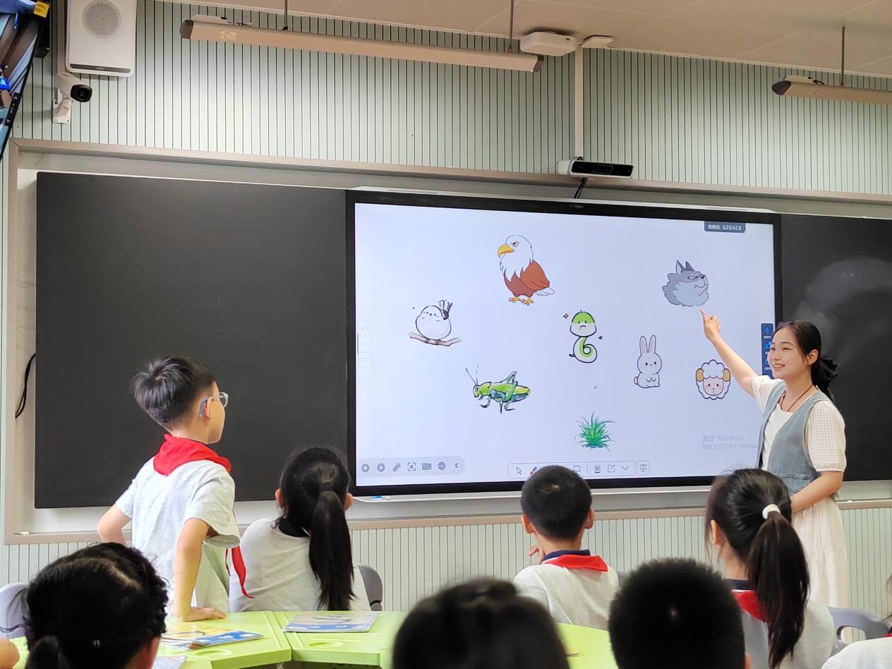 课堂伊始,文雯老师通过一段色彩绚丽的热带雨林纪录片片段,迅速抓住学生们的眼球,画面中生机勃勃的动植物、复杂精妙的食物链场景,让孩子们仿佛置身于真实的生态环境之中。文雯老师通过趣味问答让学生们分辨出植物和动物的区别,由此引出具有生命特征的物体统称为“生物”的概念,从“兔子吃草、老鹰捕兔”的捕食关系延伸至食物链与食物网的结构功能,结合生活实例解析生物与非生物的依存关系,生动展现生态系统的复杂性。