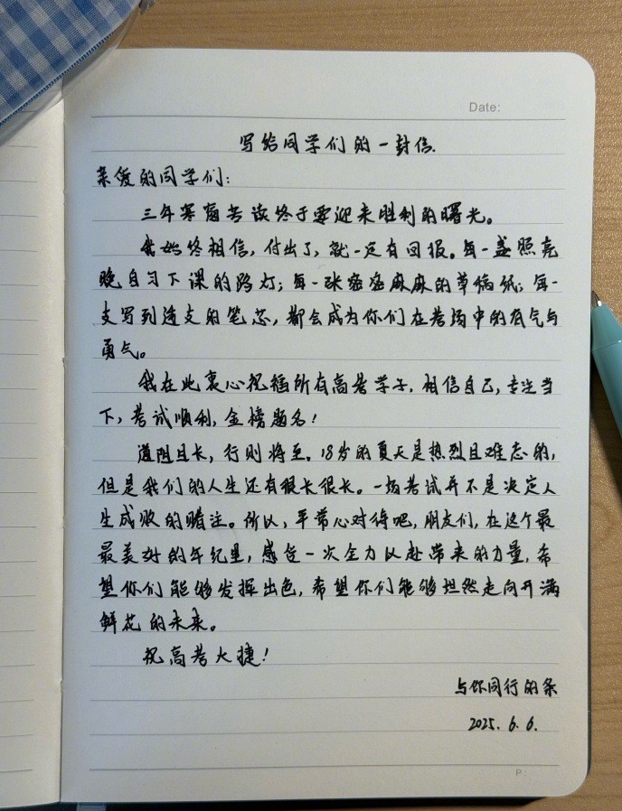 6月6日,在巴黎奥运会夺得首金的中国射击运动员黄雨婷@A阿条本条 分享《写给同学们的一封信》,祝福所有考生。