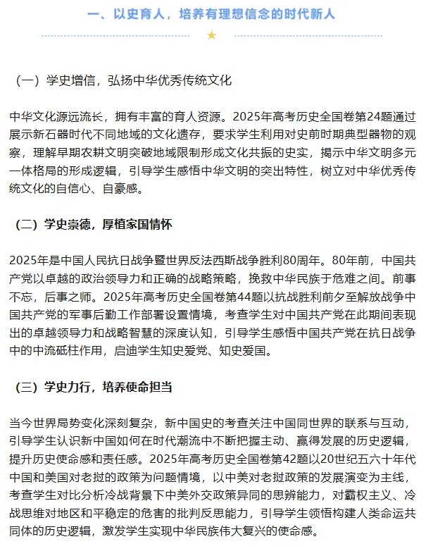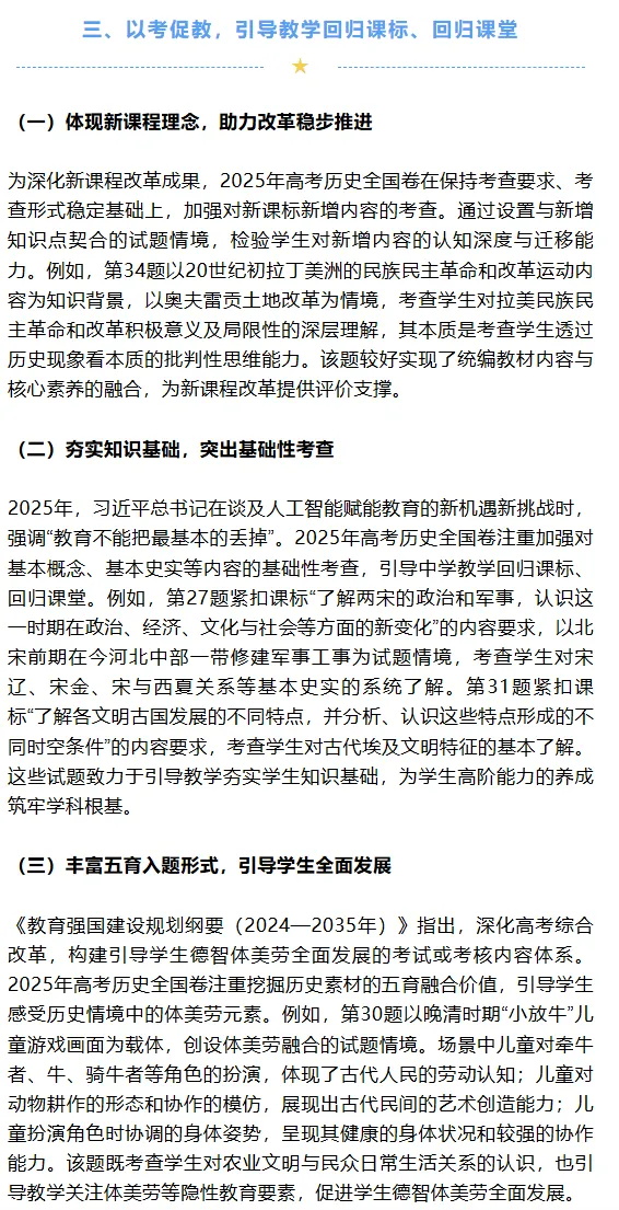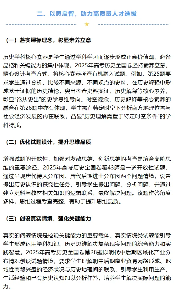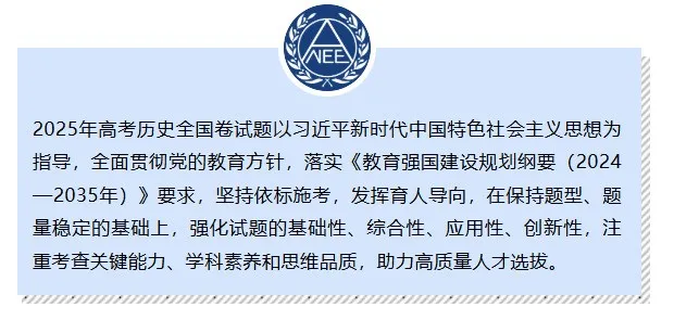 谈及题型,她认为“最后一道大题偏理论,主要考查学生的历史观,其他题目比较常规”。2025年高考历史全国卷试题评析: