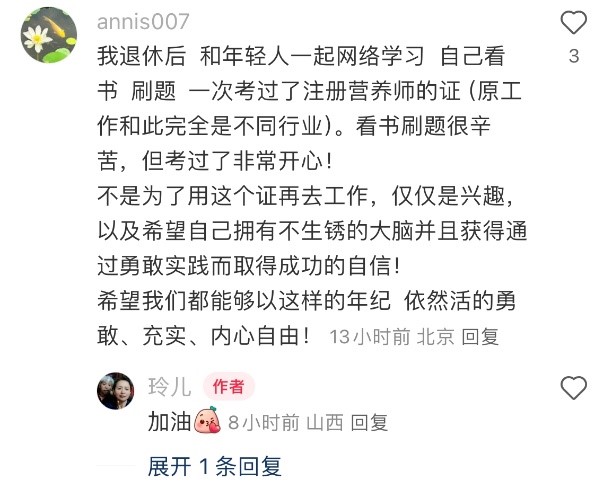 网友“annis007”称,自己退休后和年轻人一起通过网络学习,看书、刷题,在毫无相关背景专业的情况下,一次性通过了注册营养师的考试。于她而言,考取这个证件只是为了兴趣而非谋生,她希望能够通过勇敢实践,感受成功之后的自信。