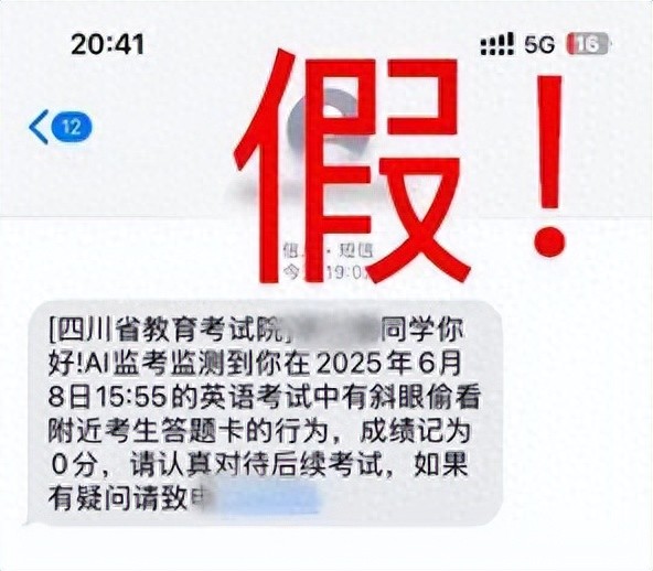 近日,部分高考考生收到所谓“四川省教育考试院”的短信,称在考试中被AI监考发现其有作弊行为,成绩记为0分。