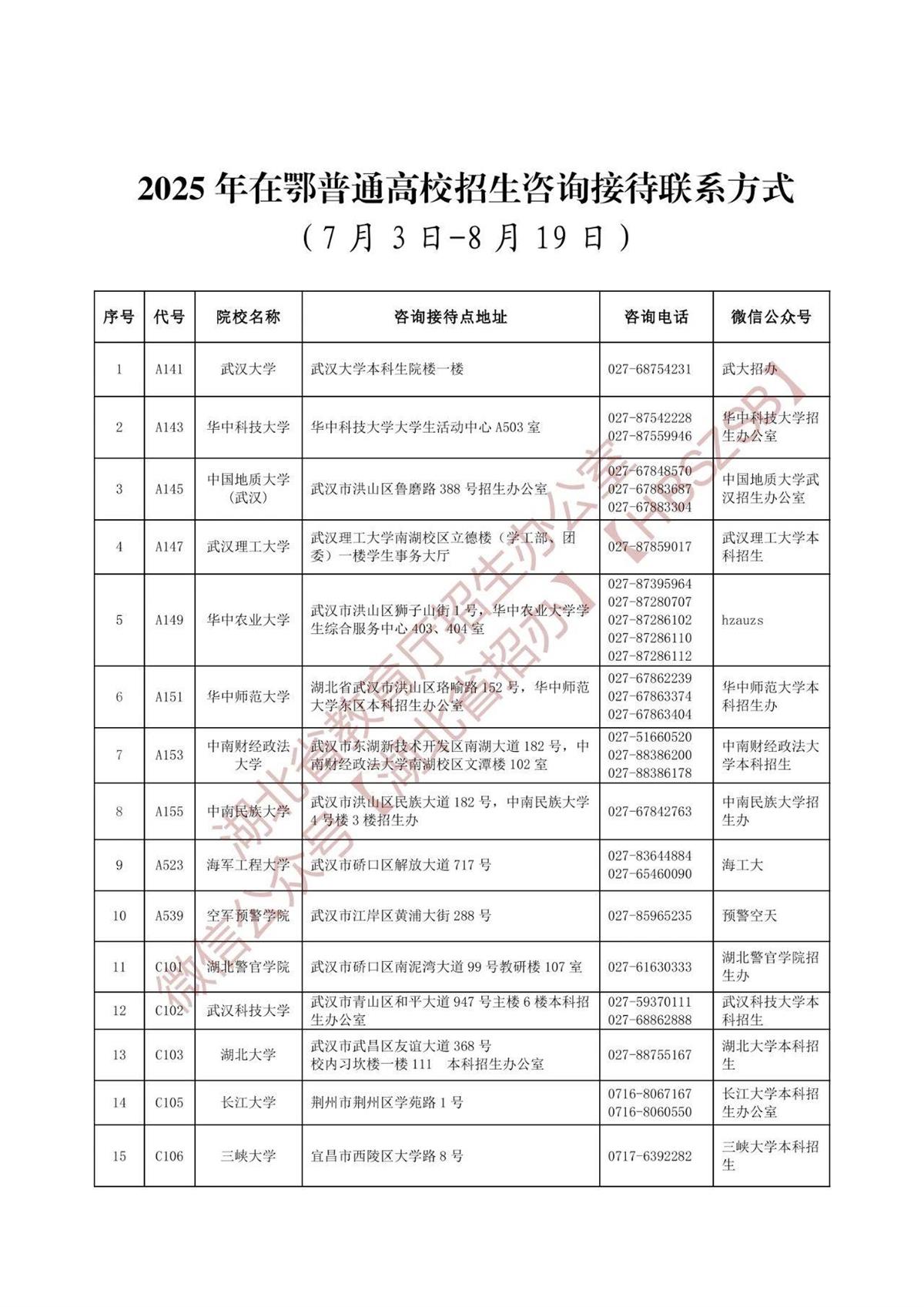 6月11日,湖北省招办发布消息,为做好普通高校招生服务工作,现将湖北省2025年在鄂普通高校招生咨询接待联系方式予以公布。