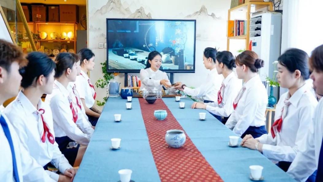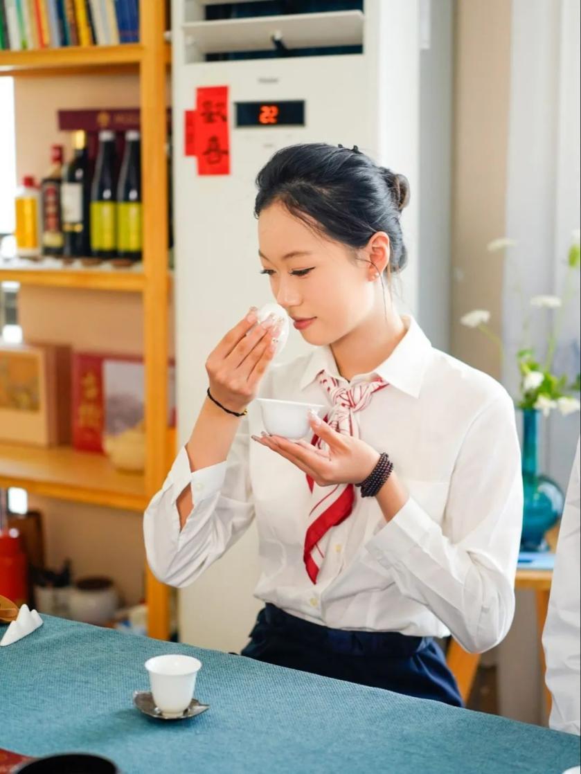 实践课上,国家一级茶艺师以两款茶叶为依托,以茶润心,以礼塑形,指导学生在一盏茶汤中淬炼服务匠心。