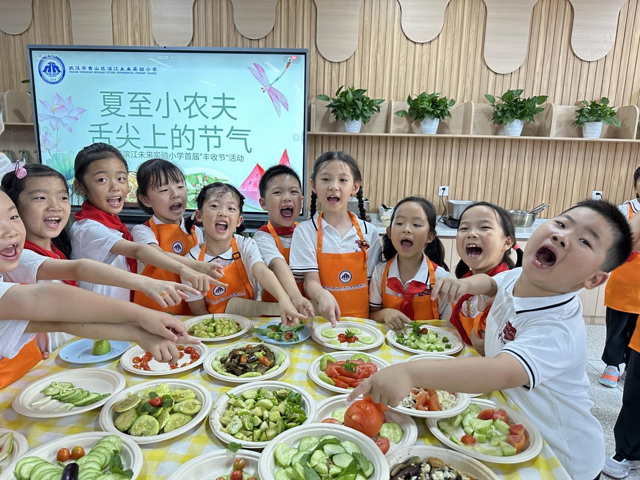 6月17日,武汉市青山区滨江未来实验小学开展了以“夏日小农夫——舌尖上的节气”为主题的首届校园丰收节活动。全校师生与家长代表共同参与,通过农耕实践、美食制作、蔬果拓印等环节,体验劳动乐趣,感受丰收喜悦,实现“从农田到餐桌”的全过程教育。