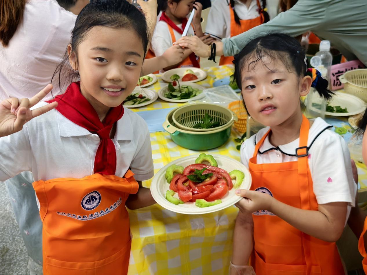 采摘结束后,学生们将新鲜食材运送至“食育坊”。结合夏至节气“吃凉食”的传统习俗,学校设置了“沙拉吧”“创意岛”“凉拌站”“凉面台”四个实践区域。在家长和老师的指导下,孩子们分组协作,学习洗菜、切菜、调味、摆盘等烹饪技能。有的小组制作了色彩缤纷的水果沙拉,有的创意拼盘摆出了“蝴蝶”、“老虎”的样子,还有的调制出了迎合夏至节气的凉拌黄瓜和番茄鸡蛋面。